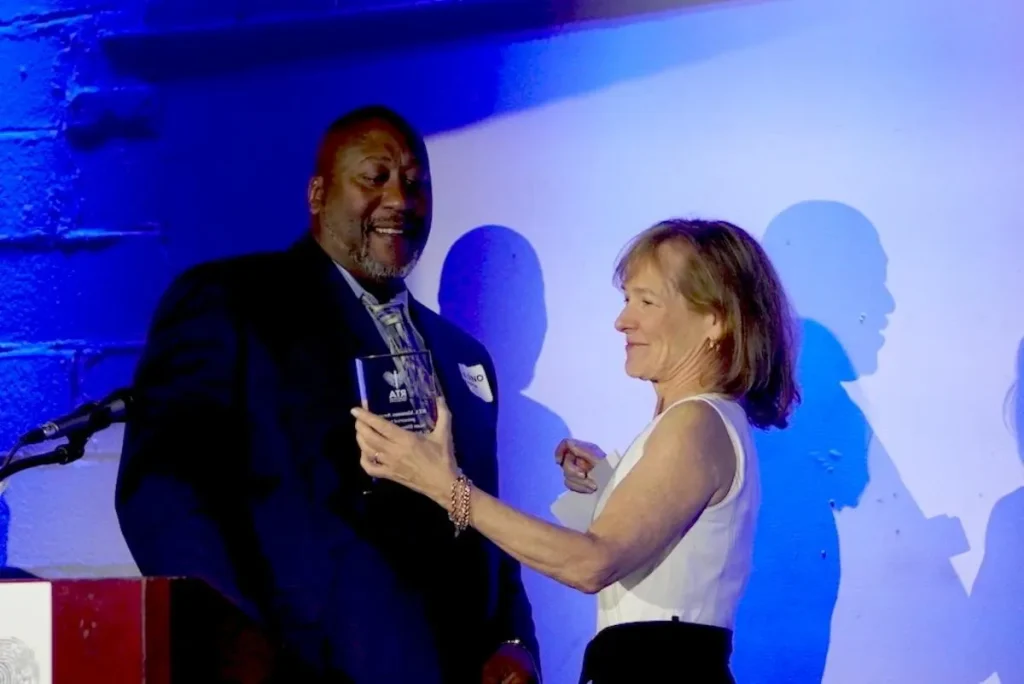 Johnson receives the RTA Alumnus Award from Board Director, Karin Young Shiel.
