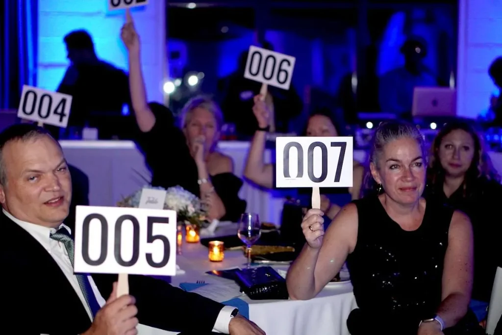 Guests participating in the fund the mission paddle raise.